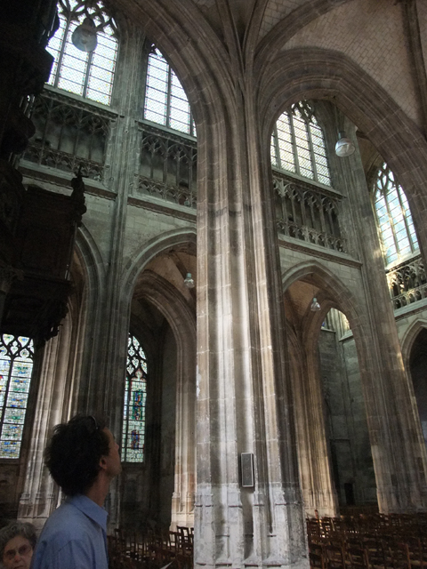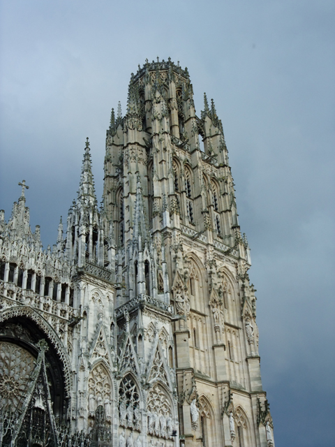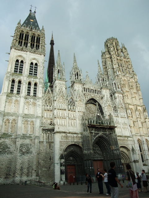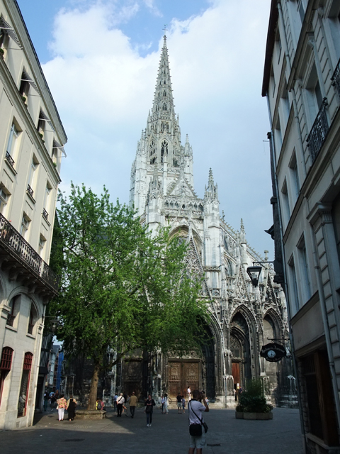 城市疊簷之後,遠遠就可望見尖高的盧昂大教堂頂梢了,但領隊帶我們轉個彎,先繞至規模較小的聖馬克魯教堂。雖然它占地並不算大,然雕工卻是異常精緻華美。由細碎尖塔簇擁起的高塔尖,以兩側飛扶壁的斜樑,架構起三角形的立面。五座門廊中大側小分立,頂著細緻的鏤空刻花尖拱,門框內則是細密串接的人像。很可惜地,當我們踏入教堂內,就被守門人以時間已晚為由趕出,只匆亂搶拍下一張幽暗高深的主廳照片。
