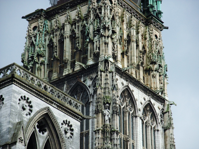 行經一座塔樓,突然我發現我們正位於盧昂大教堂側後方,此處花窗不見彩繪玻璃,只存中央尖塔半掩在空盪框格後,牆面失了屋頂,看了很是空寂。但再行幾步,從圍籬望進,長形主廳與主塔還是相當完整的。尖拱花窗與飛扶壁整齊排列,主塔角邊的龕室飾以各樣形貌的人形雕塑,以繁密的尖塔、尖柱、尖拱,堆疊砌上,最後拉伸成法國最高的教堂塔尖。