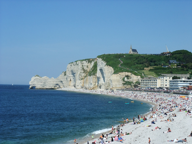 穿過商店街,便是開闊海天。行道圍欄外的沙灘,點點密密的觀光客,逐浪、奔跑、日光浴。圍欄處立了張仿圖,是莫內曾經揮筆的景畫,白帆停泊於浪石交激的沙灘,遠方高懸斷崖下,一道白巖橫伸,底下被濤浪沖蝕出拱洞,這便是此地被稱作象鼻海岸的因由了。望向右方莫內描繪的畫面,白巖圓圓胖胖,拱洞不大,讓兩側岩石望起來像小象短短的鼻子與腿肚,非常可愛。
