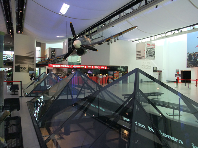 建築當中門廊如崖壁中裂開的傷口,導引參觀者進入。由於我們未打算買票,所以只在接待廳大致逛繞。展廊似乎位於地下室,從特意挖出的透明洞口,可以看到底下一些當時的進攻戰略圖,搭上天頂懸掛的戰鬥機、黑白紀錄照,一一都提醒我們戰爭的殘酷。
