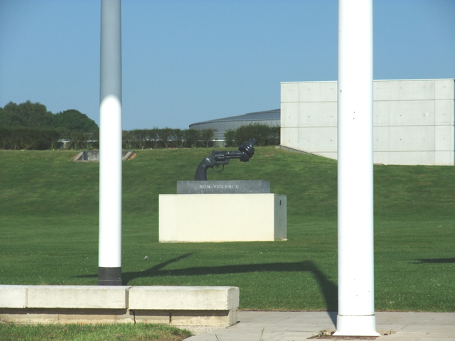 行了段路,我們看到紀念館。寬廣的方正建築,以淨白不帶一絲裝飾的外觀,紀錄對當年無數英靈的悼念。廣場旁有個手槍雕塑,槍口纏扭成結,表達反戰意念。