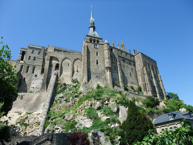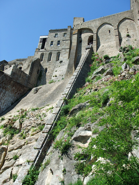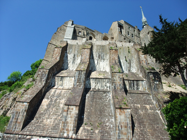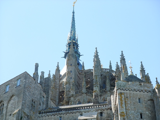 而當隨車駛近時,它的輪廓更顯清晰,聖米歇爾修道院依順山丘地形,以雄偉的城牆包覆支撐,傾斜的扶壁如風拂擺尾,在島的側邊延伸出飄逸曲線。高牆之上是教堂本體,面對我們的是側翼,一旁後廳的飛扶壁以錯落的雕刻柱,形成一片宛如火炬舞焰的景致。中心處則是尖細的主塔,像銳利鋒芒,一柱擎天,輝立著持劍的大天使聖米歇爾。
