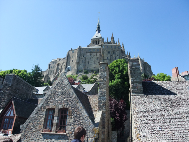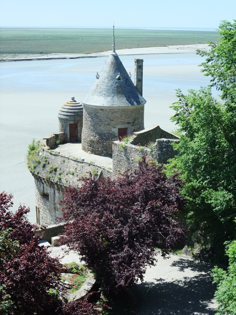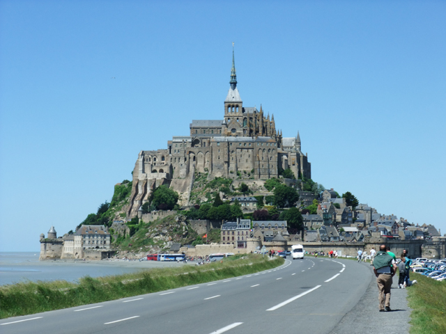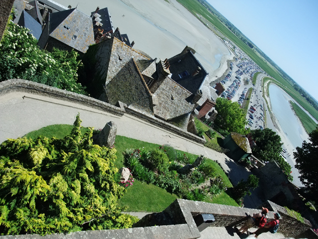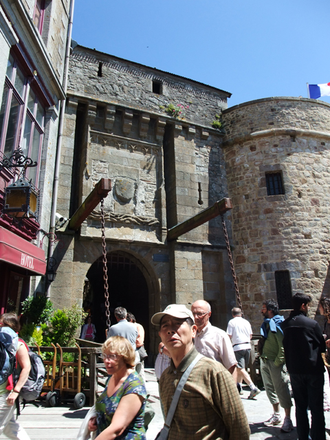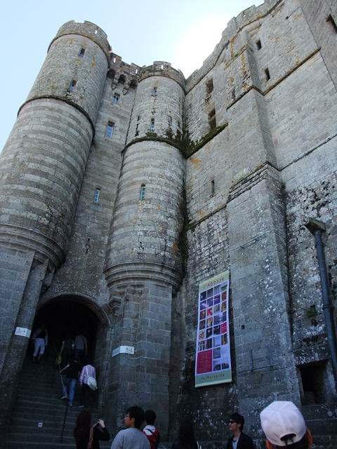當我們到達山腳城門口,往昔的羊腸小徑已經開闢為寬廣大路,一旁空地停滿密密麻麻的車輛。但如此為了觀光事業的改建,卻也改變了海潮流向,孤立於浪影的景象即將走入歷史,令人唏噓。不過在重視文化遺產的現代,據說法國政府已有一連串的規畫,開挖淤泥、修築堤道重新導引海潮、將過道改為跨海空橋等等,以期重現古代聖山隨潮隱現的風貌。