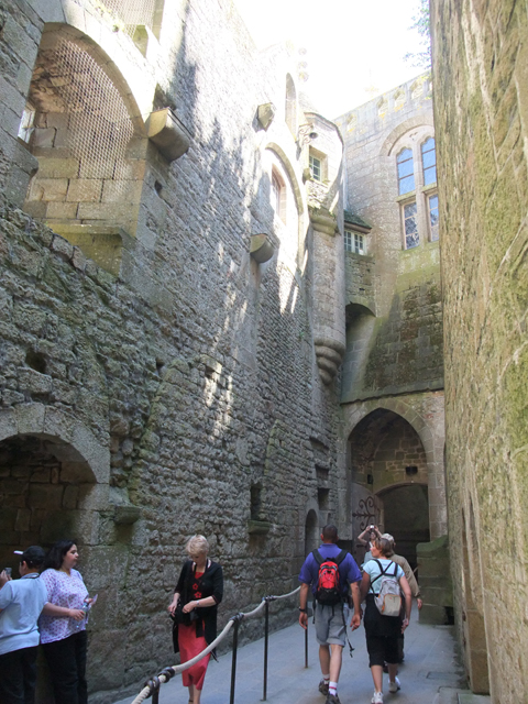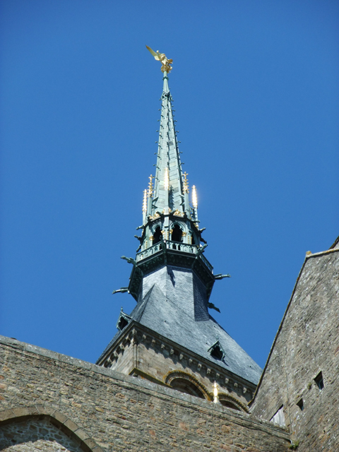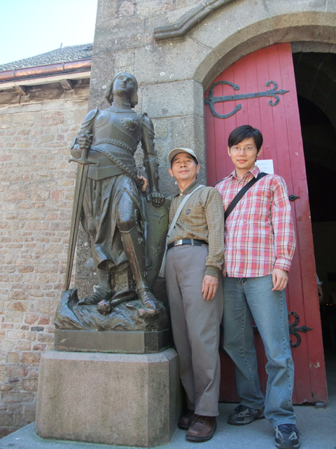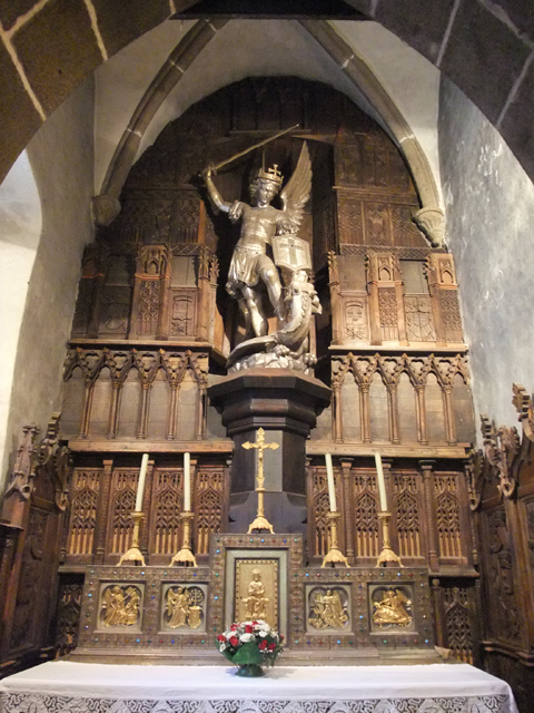 城內的主巷道,蜿蜒而上,磚石砌成的門樓與防禦塔,保留了中世紀景趣。遊人如織,各式商家的招牌也五花八門,當中還見到這兒蛋餅的創始元祖店。途間,有座小小的禮拜堂,門口有尊等身高的持劍女武士銅鑄像,領隊說這是聖女貞德。而禮拜堂裡,尊奉著大天使聖米歇爾,在雕刻得宛如層層柱廊樓閣的背板前,腳踏舞爪惡龍,高舉寶劍。一旁的玻璃花窗,他的髮絲飛舞,英姿煥發,灼亮的赤紅劍刃也正砍向多頭血色巨龍。