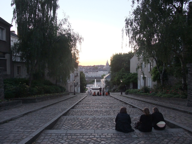 而順著大門下望,石板梯階沿著斜坡通往河岸,岸邊有座噴湧泉池,再遠些,是對岸高低參差的疊樓。此時,幾將落盡的夕陽餘輝將天際染得金黃,數名青少年三三兩兩坐在台階,端凝著這份終暮之美。我也隨之靜靜望著,直到霞芒逝去。
