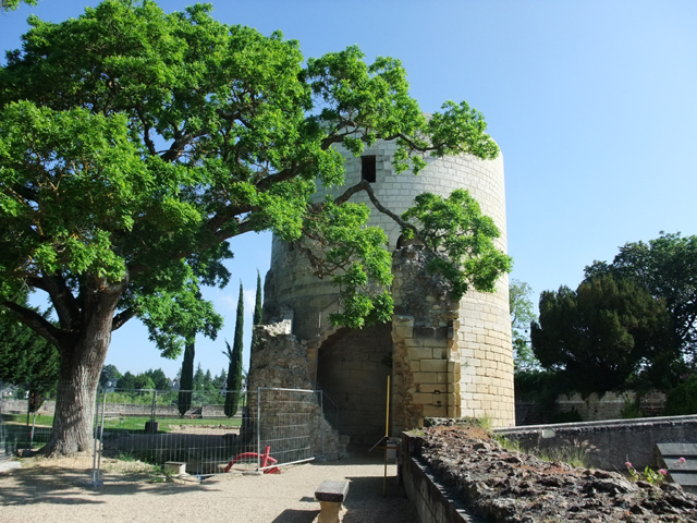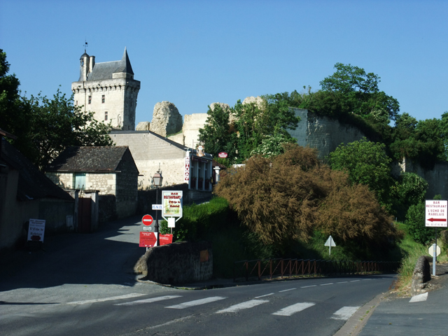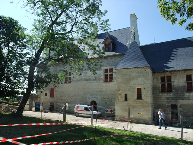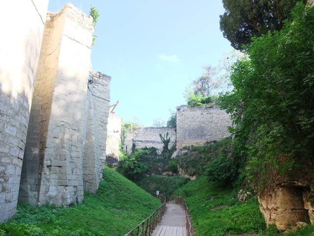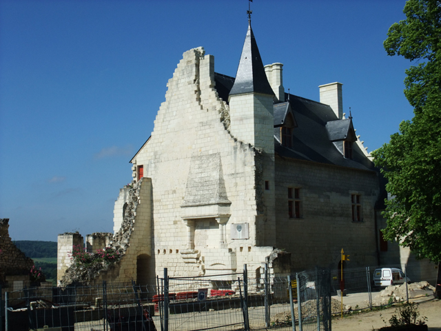 從空橋越過護城壕谷地,進入昔儂前城。這兒的林木茂盛得多,而在靠河的圍牆側,聳立著一座大型建物,由斜脊跟塔樓錯落拼接,是查理七世及歷代領主的宅邸。外型看來大致完好,唯一端約三分之一的屋舍被砲彈擊毀至只留下殘跡。那兒原本是主廳,外露的壁面尚有座大型壁爐,也就是聖女貞德在人群中,找出故意隱匿的查理七世之處。算是記印這歷史性一刻的地方吧,只惜就這樣將隨時間消弭。儘管從工地圍籬看來,是有想修復之意,但巧婦難為無米之炊,就算重新砌起,也再也不是原本曾見證過往的那些磚石了。
