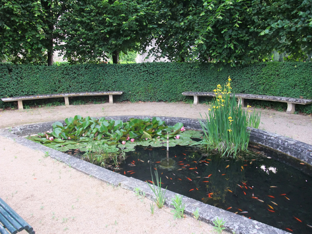 反倒二樓走廊末端門扉推出去,竟是個闃靜的山坡小庭院。一座潔白小禮拜堂,帶著些許雕刻,立於山畔。順著由藤架裝飾的柱廊步道一路往前,早晨清新的空氣,伴著間或的鳥語啁啾,很讓人身心舒泰。末端一個曲折,接續剪拼成幾何圖案的樹叢花圃,漂蕩荷葉、魚群悠游的半圓型水塘,繞回門口的林蔭廣地。