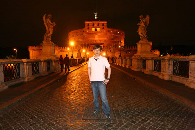 而接下來的景點,居然是聖天使橋,於白晝無法相遇的,怎料卻在夜間看到它美麗的身影。一對對持著當初耶穌受難刑具的天使,於橋的兩側,延伸至末端的聖天使堡。