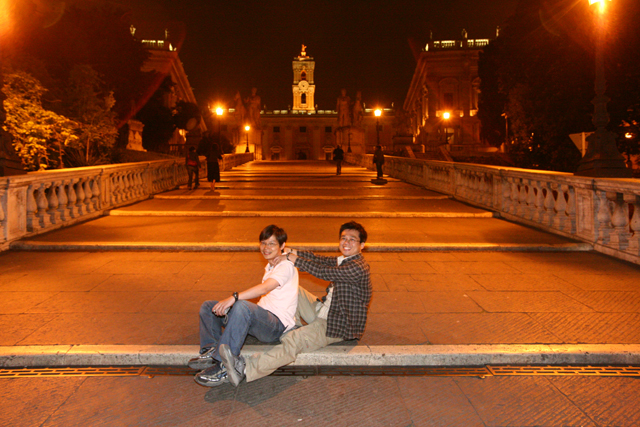 下了山丘,我們來到艾曼紐二世紀念館的後方。寬廣步階,層疊往上,坡頂廣場的建築,在正中鐘塔燦光的投射,微微現出輪廓。而整條步階,於路燈的襯映下,彷彿是個摘星大道,通向漂浮在夜空的堡壘。