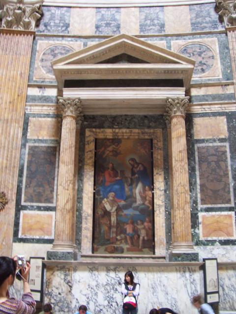 而其間一隅便祭有拉斐爾的遺體。壁面橢圓框裡,嵌著一尊半身雕像,底下一方石棺,靛藍花束靜靜作伴。一代大師年華早逝,若能多些延年壽命,該是遺留更多曠世鉅作吧。