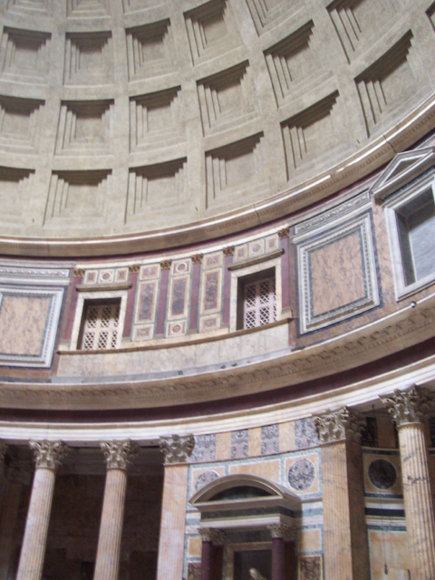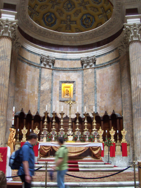 儘管眼前的萬神殿外觀看起來蒼老樸拙,但其實已是在舊萬神殿的殘敗遺址再行構築的建物了。然而相對於外在的厚實無文,當一步步踏進其祭奉殿堂,便會訝於內部的精緻巧思。