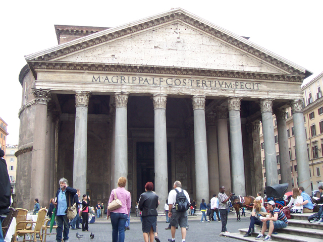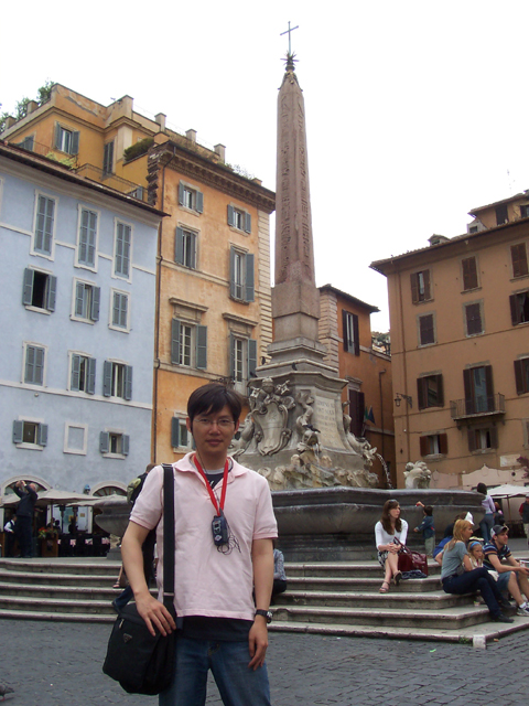 搭了一段車,接續在宛若迷陣的街巷穿拐,突然萬神殿的側影便出現在眼前了。廣場裡,一方池子中豎立著高聳的埃及方尖碑,托撐台座以游魚海妖作飾,噴吐清泉,而與之相對的便是呈厚重圓柱形的萬神殿。