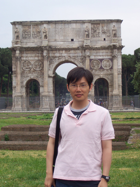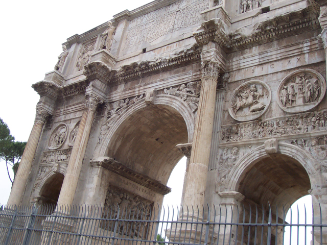 離開鬥獸場,我們走近大道中心的君士坦丁凱旋門。這座拱門是紀念當年君士坦丁大帝一統東西羅馬帝國,雖然年代久遠,但上面的細緻雕刻仍是清晰可見。四道頂上豎立雕像的科林斯柱,分隔出一大兩小的拱門,弧頂接縫處刻滿張起雙翼的天使,小拱門與橫楣間,則以數個圓盤雕畫作點綴,最頂的橫楣中央是緊密排列的字母,兩側同樣是各色不同的人物故事。據稱整座拱門的雕畫,大部分都是從更早年代的作品搬運拼貼而來,描繪爭鬥戰史與帝王功績。