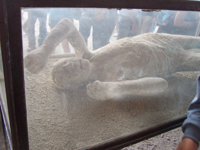 神殿廣場的另一端建築,展示著考古學家挖出的當時文物,牆上是面已呈灰濛的大型繪作,赭紅窗格間有不同姿態人物。不過最引人注目的是兩具曾被火山灰掩埋的遺骸。玻璃棺內,扭曲身軀被凝附成岩,已呈空洞的深凹眼口,似乎仍可聽聞哀號餘響,往天抓握的雙手,記錄著那一剎那的苦痛。