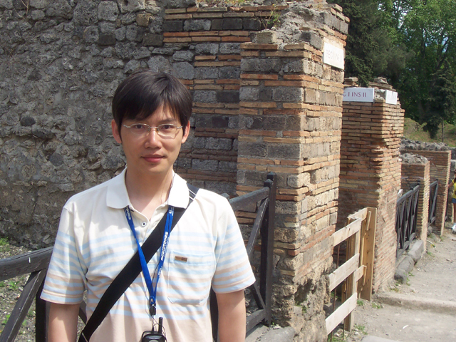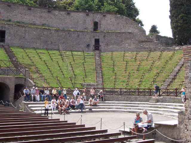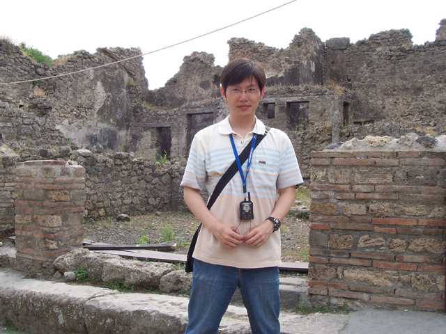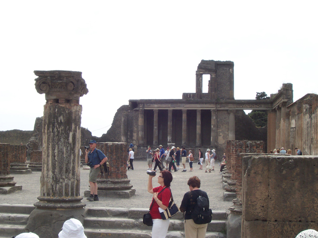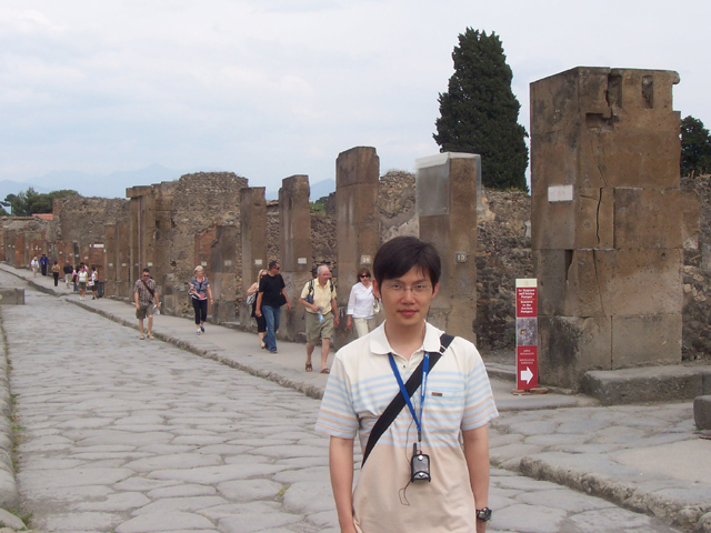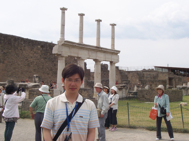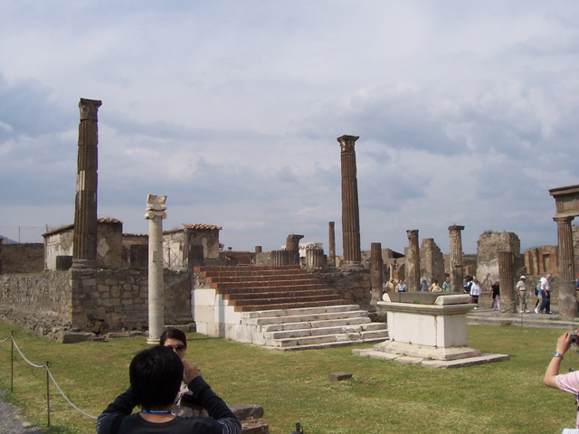 須臾,我們便抵達龐貝。從外圍望去,看不出什麼端倪,只有密密麻麻的觀光客跟小販。不過在這兒請到的當地導遊滿特別,或許是有學過中文,所以他很認真地全程用國語講解。但是那濃濃的異國口音實在很難辨得他究竟想表達什麼,倒寧願他用英文,也許還能聽懂多些。像是在大門口,他朝著某處一指,嘰哩咕嚕半天,我才大概恍悟,科林斯柱頭的造型便是來自那邊的蕨狀花葉。