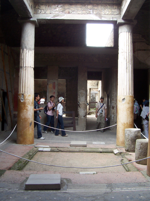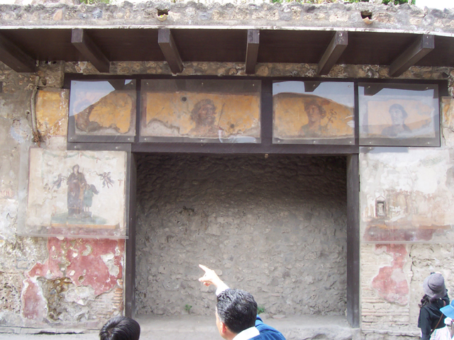 而這邊牆上留存的彩繪又是不同主題,廳廊內排列著各色男女,依稀聽聞是龐貝人們祭祀的神衹。一旁斗大的文字則是競選標語,不介紹倒還滿像街頭被人胡亂噴漆的發洩。有些處所被鐵籬圍禁,透過柵欄望去可以看到幾列柱廊,猜測應該是小型的神殿吧。某些住家則可瞥見地面的馬賽克拼飾,有的呈居家犬吠,有的是海神三叉戟與海豚圍繞的主題。