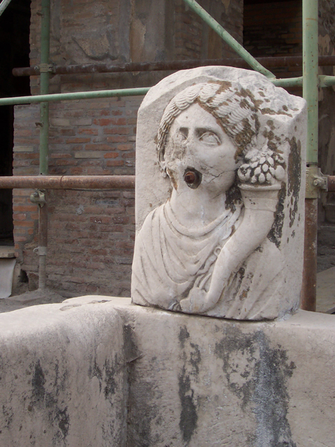 從紅燈區穿出,拐幾個彎,眼前的區域便不是擁擠的街巷。開闊廣場周遭,座落著一些高聳柱廊及拱門的殘跡。這裡是幾個神殿的遺址,不過從殘餘的台座、三兩孤立的高柱,實在很難勾勒出它們原本的形貌。有一片門框很難得地保存其捲花帶飾,有此觀之,整個神殿區當年應該也是妝點得富麗堂皇吧。