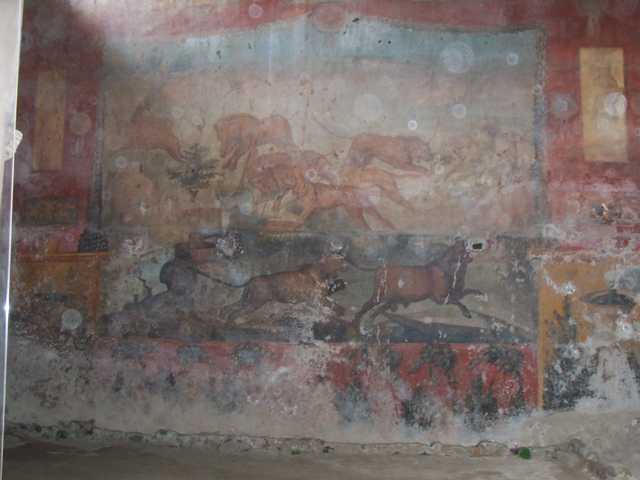在其中一個算是保留完整的屋裡,拿著圖片的導遊跟我們講解前後對比。原來眼前的凹窟過往是個中庭水池,陽光從天井透入,照映著牆柱間的繽紛彩繪,不過現今也只存斑剝的石面了。還好在某些殘牆上還隱約留有顏彩,細辨下,該是描繪著原野間耕種放牧、抑或犬獸追獵的景況。