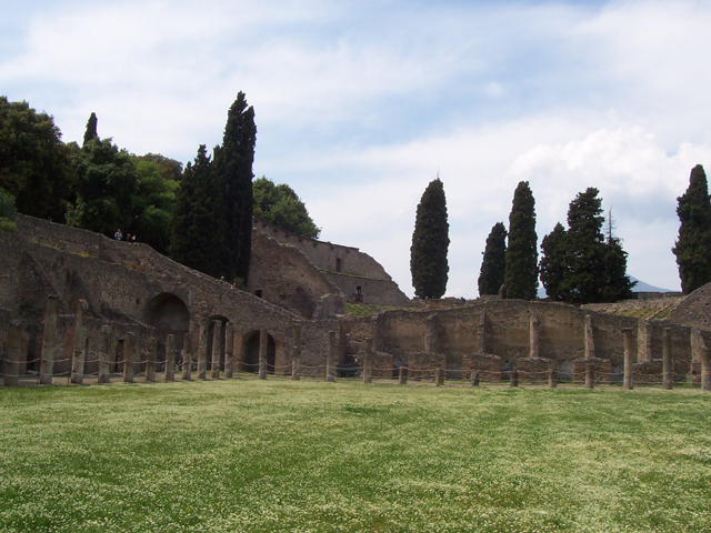 穿過雕滿方窗的殘破城牆,我們便進入龐貝市鎮的範圍了。首先看到的是個廣場,中間植著修剪過的草皮,外圍則是排列整齊的樸實多立克柱廊。近牆處用磚石分隔出一個個區間,猜不出這地方是做什麼用。