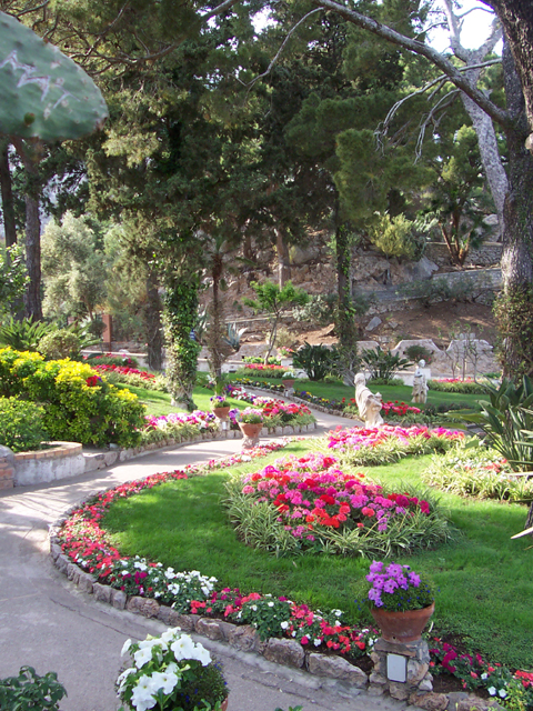 接著我們依循指示,爬上位於崖邊的奧古斯都花園。穿過步徑曲繞,繁花拼合的設計園林,圍欄外的海天一色開展。嶙峋陡巖在左側伸出臂膀,延伸出兩座小島,我戲稱那是亞森羅蘋故事中的奇岩城,順著海底密道穿入小島中心,便是祕境。