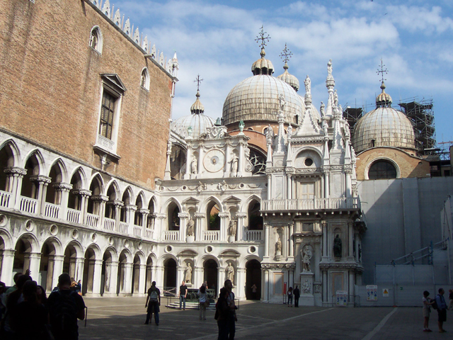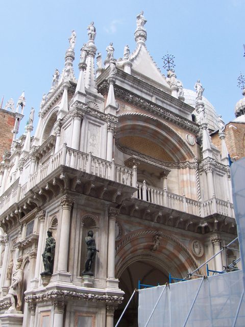 走進道奇宮的內庭,正對我們的是一道帶有華麗裝飾牆面的穿廊,在它的後方,可以看到聖馬可教堂錯落的圓頂。這廊道是總督及大官們出入的正式通路,也難怪以許多裝飾壁龕、雕像,支撐頂上的鐘面及叢聚尖塔。