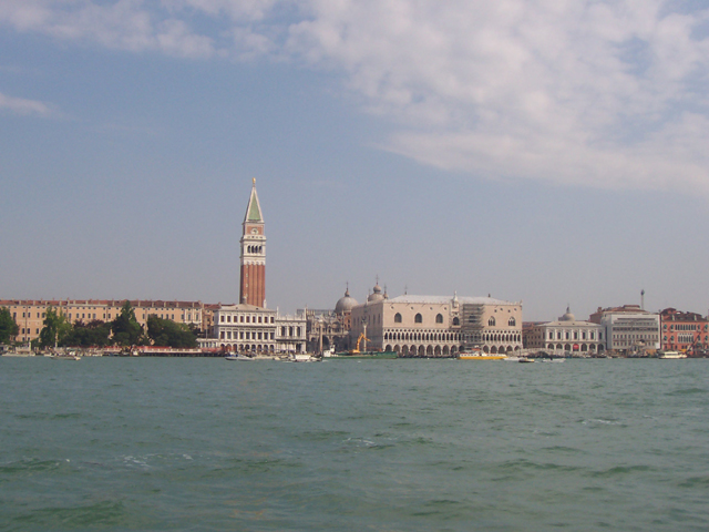 一座醒目的鐘塔先是映入眼簾,之後的是圓拱頂群聚的教堂,我暗自揣度著,該是聖馬可教堂了。果然隨著航行,廣場建築群的輪廓亦愈清晰,威尼斯的飛獅雕像踞坐在港口柱頭,傲視一船船入港的人們。