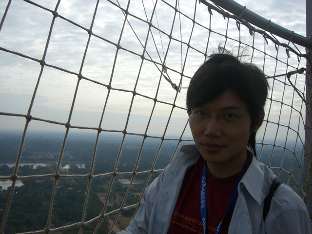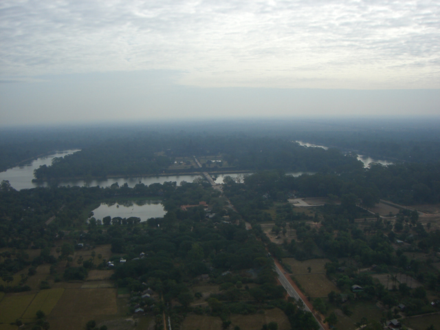 隨著高度攀昇,原本阻隔在叢林之後的小吳哥,漸漸探出了輪廓。他的五座尖頂、層層簇擁的迴廊、開闊廣場、及最外環繞的護城河,都清晰可辨。