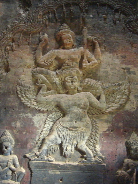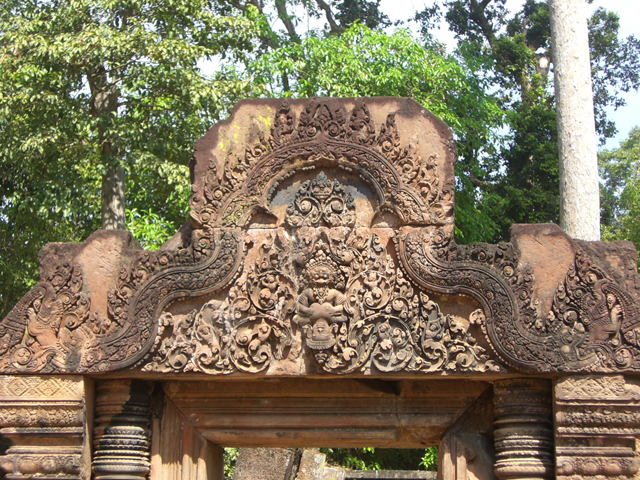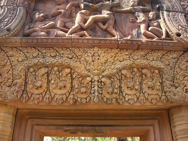 在入內門前,導遊帶我們轉了個彎,來到一座已經傾圮的廳閣。門楣上的山形牆雕了一幅爭鬥圖,中央是以獸臉形象出現的毘濕奴,正壓伏撕咬著人面惡神。環繞主角的則是如浪花般的捲飾,浪花末端又連生出一個個姿態各異的小人,最外圍則以曲帶狀的華麗框紋作結。整個作品活靈活現,充滿舞躍的生意。