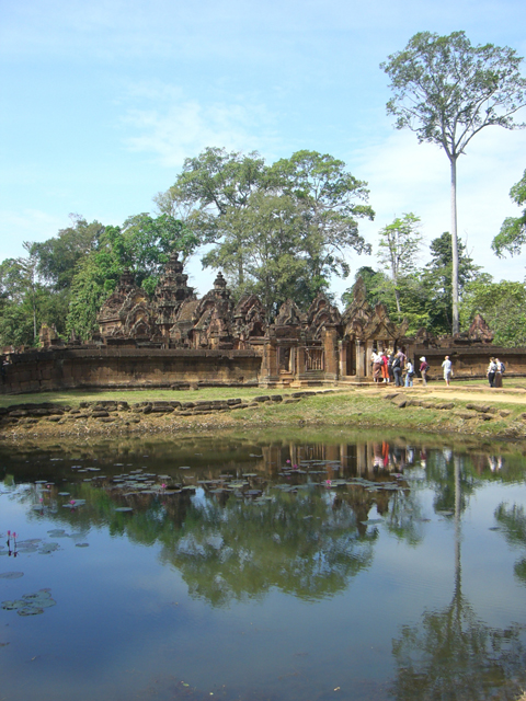 繞回正路,女皇宮的左側牆外,是一波清池與護城河連通,幾朵蓮花正含苞帶羞,斜倚著碧綠蓮葉在水面輕擺。遠處叢密樹傘如茵,遮蔭著小巧女皇宮,在水紋中勾墨出一池清麗彩繪。