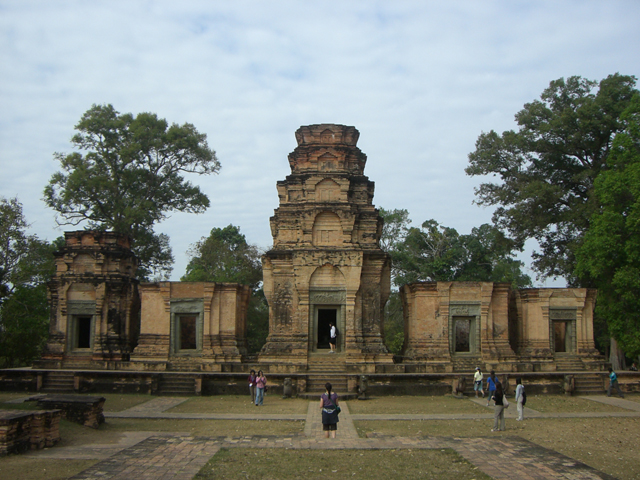 荳蔻寺的寺體架構,跟前幾天看到的設計都不太相同。五座單塔中高側低,在平台上橫列成一排。除了中央塔有層疊縮減的塔尖,其餘的塔樓都以廳頂整齊平削的姿態呈現。