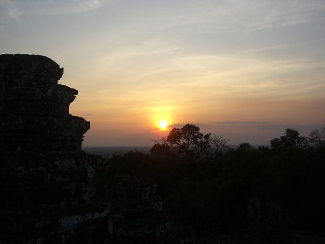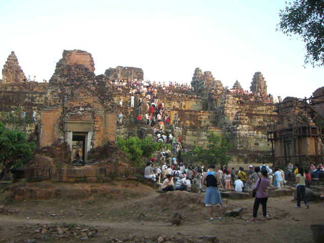 雖說是寺廟,但其實也只見得階梯狀台層,週遭散佈塔樓遺跡,不過等待日落的觀光客早已密密麻麻綴滿台頂所有可站立之處,連登廟陡階都佈著拼命往上擠去的人潮。