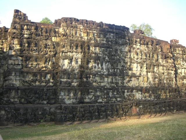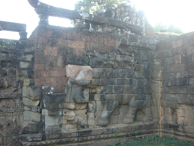 台座一路往南連綿,堆拼石牆依稀可辨圓圓胖胖的大象,長牙捲鼻,煞是可愛。其餘斑剝處似是姿態各異的人像,揚手抬腿,形如舞宴。而平台上下正面,遠望像有浮凸柱形雕飾,但上前細觀,其實是三象頭併排,長鼻曳地,摘取蓮花。