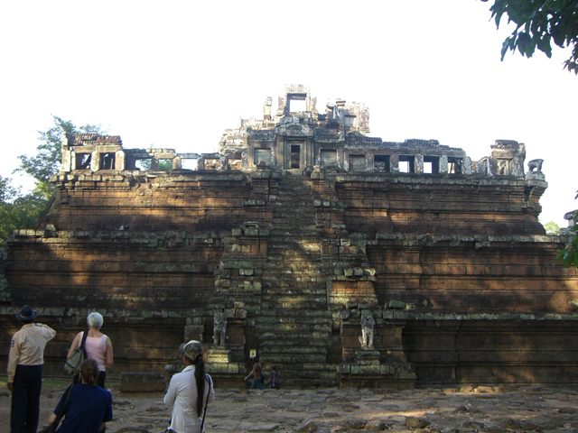 空中宮殿取名讓人帶著無盡揣想,但實際上並非高築雲端的連綿樓閣,只是座建構在平地上的台層式建築。往上縮減削尖的外觀,中央陡峭階梯兩側的獸型雕像,帶著些許馬雅金字塔風,只是台頂架上的是吳哥窗廊拱繞的拉高殿閣。