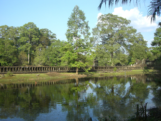 從巴戎寺後穿過樹林,一池靜波映著綠蔭在眼前開展,而隔著池水是一道長橋劃過,通向左側像是座矮丘的巴本宮。