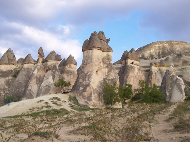 出了博物館,往別處山區行去,我們在一路邊有著四根柱狀物的地方停下腳步,原來這就是著名的精靈煙囪,這命名的來由,是因為它既像戴著小三角帽的精靈,又像支煙囪。才剛照幾張相,烏雲便飄了過來,天色霎時轉暗,雨點一顆顆落下,接著開始狂舞。其實在卡帕多奇亞的這一天,我們一直是被大片烏雲追逐著,在車上行進趕景點時,窗外常常是水霧漫布,我總是望著天色,看到雲間透出一道光就很高興。好在我們每到一些重要景處,天公都很給面子,沒讓我們被天氣敗了興致。