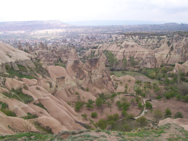 卡帕多奇亞的景緻導因於火山岩的風化,視野所及都是碎亂的尖峰,像是洶湧的潮浪撲抱參差突立的礁岩,但在剎那間被終息了時光的流洩。在此生活的人們大多鑿穴而居,最有名的就是地底城市。說是城市,其實也並非有著規矩房舍,從入口一路往下,一個個石穴順著窄小曲折的通道往兩側拓展,就算是稍大的廳室,也只不過像是一般房間大小,導遊指著一個個穴窟說這是馬廄、廚房、餐廳、禮拜堂等等,但若不是帶些想像力,也很難猜度出原本模樣。據說它的規模還要再往下深入好幾層,迂迴分支。長時間生活在這陰暗低矮的空間該是個苦差事吧!不曉得當時的人是怎麼度日的。