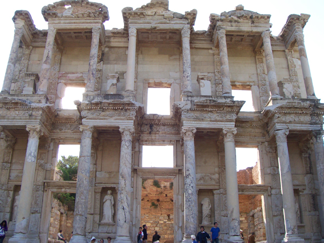 回到大街上,經過雕工細膩,有個小圓拱門的哈德良神殿,便可以看到著名的大圖書館了。大圖書館現在只存兩層樓高的門面前牆,前牆上有希臘風格的柱門,飾以華麗頂簷。門龕內嵌著四座女神像,代表博學、智慧、科學、美德。走進館內,果真已是空空如也,但從門牆的雕飾構築觀看,圖書館原本的樣貌也該是燦美絕倫。