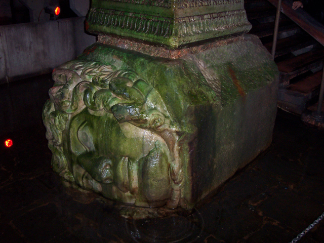 出了皇宮,在一個不起眼的小屋裡買了門票,往地下走去,便是個奇異的場所—地下蓄水庫。地下蓄水庫是個由上百根石柱撐起的巨大昏暗空間。微黃燈光下,水滴緩慢地在池面及木橋上敲奏。踏著木橋,走到最裡處,兩個梅杜莎的頭一側一反地分別被壓在兩根石柱下。這是因為所有在這水庫裡的石柱都是從各地尋來,式樣各異,長短也不同,梅杜莎的頭便是為了湊合高度而成為基石。她若有靈,是否該哭泣呢?