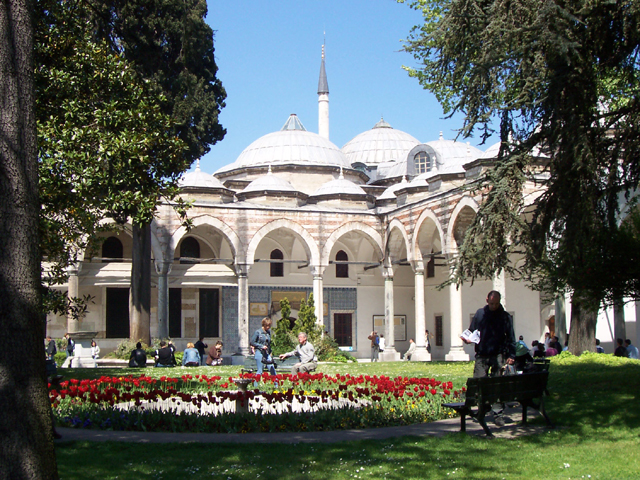 托普卡匹皇宮是翌日第一個參觀的景點,皇宮內其實沒有想像中那麼帶著強烈回教色彩,不過大部分的廳院仍能看出屬於皇室獨有的富麗堂皇。從外面修剪整齊的林園、使節住所,穿過一扇扇門廊,往內進走去,政廳、圖書館、廚房等分立道路兩側。大部分館築都已改建成博物館,展示著首飾衣裳、兵器盔甲、瓷器餐具。可以看到帶著濃濃中國風味的青花瓷、鑲嵌複雜璀璨的精雕飾品、擺弄線條藝術的回教書法、以及一枚四十九顆鑽石簇擁的八十六克拉心形巨鑽。