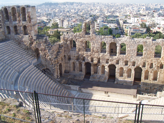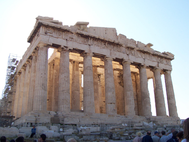 順著台階爬上在山丘頂的衛城,途經一座盤據山腰的圓形劇場,再穿過重新整修中的迴繞台階與門廳,一直只能在書上看到的神殿漸漸展擴,最後佔領整個視野。儘管散遍各處的鷹架訴說著他的遲暮滄桑,頂簷上的刻飾也殘落模糊,然整個線條架構仍能探得當年身為雅典精神象徵的威儀丰姿。原本當中應該有座巨大華貴的雅典娜神像的,只是現在已不知遺佚湮沒在世界哪一方。