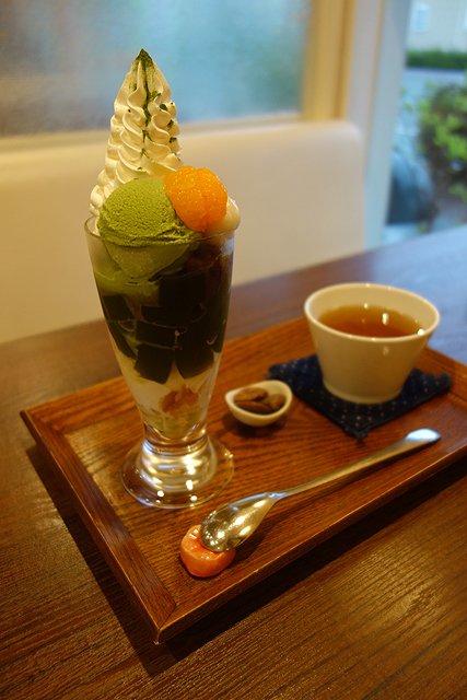 拋下停車的旅伴,我快步衝去推開大門,勉強壓線,見店員沒給我歉意笑容,而是招呼帶位,心終於安了些。翻開菜單,裡頭品項比意想中的還要多,被標上人氣第一的是「抹茶聖代」,它有幾種變體,焙茶的、將冰淇淋替成布丁的、以及適合小孩的迷你型。
