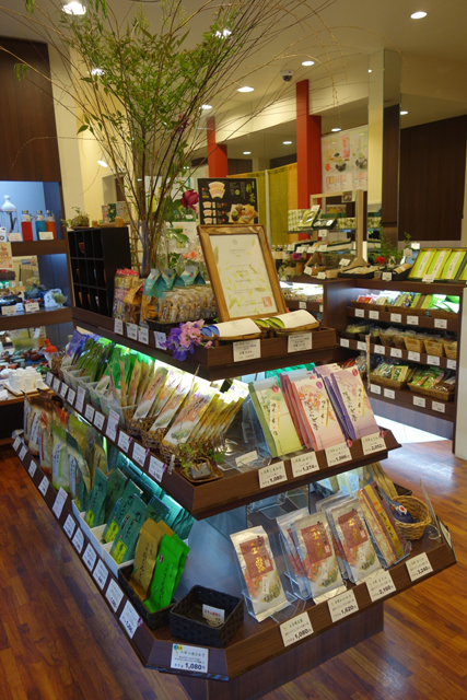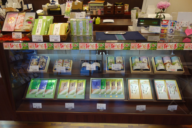 點好了餐,我在店裡稍稍走逛,除了身處的四人桌區,他們還有以花卉妝點的長吧台,由於鄰近晚餐時間又快打烊,只有服務生低頭整理,很難看出是否兼具茶席或茶道演示。再過去就是進門就瞄到的商品區,身為「牛島製茶」的品牌延伸,很合理擺了不少自家茶葉。根據來之前的調查,它在「八女」也算前幾大,雖然沒經營抹茶,玉露及不上「星野製茶園」的名聲顯赫,百年歷史自有其功夫,煎茶品項分等龐雜,光是華麗的包裝就令我看得眼花。