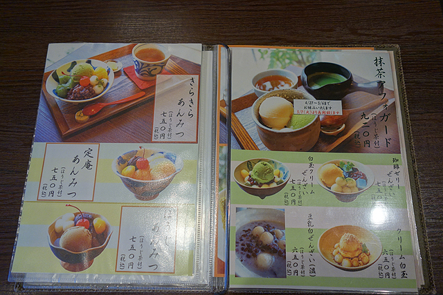 往後翻為一系列碗裝的「餡蜜」,這東西也有冰淇淋,但通常會配佐一大球紅豆泥並淋上黑糖蜜,很容易甜度爆表。隔壁有點類似的是「善哉」,它本來應是紅豆湯,可能為了要搭冰淇淋吧,看起來湯汁收得挺乾,與「餡蜜」相比,好像就只有配料的排列差別。同一家族還有「阿法加朵」,初型態是以咖啡澆淋的冰淇淋,在這兒改附上一盅抹茶,能防止配角搶戲,保證茶香。