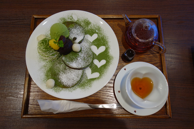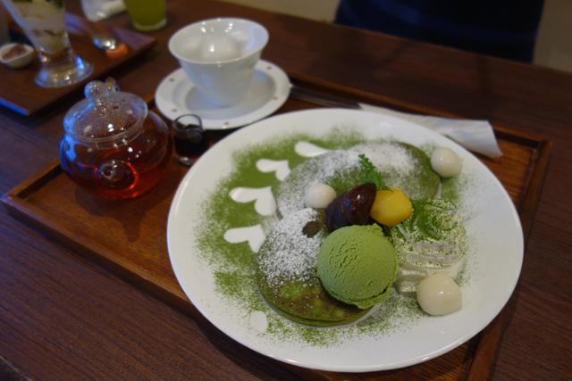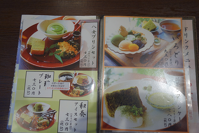 一頁頁掃過,我看到來此的主目標「濃茶鬆餅」,微微煎過的類銅鑼燒軟餅以抹茶冰淇淋配襯,碧綠茶粉灑得滿滿,相當誘人。當然台灣也是有店家抹茶粉灑得毫不手軟,但這邊用的可是「八女」自傲的玉露啊,最早在網路看到別人介紹,好奇心便被拉到無敵高,決定無論如何都要吃吃看。