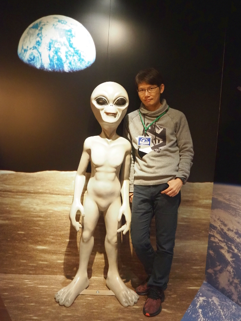 既騰出空間給人住宿,館內自不可能僅以圖板展品簡單了事,是的確配備了天幕投影館、天文望遠鏡,也留了時段給宿客體驗,儘管這也是下訂此處的因素之一,哪曉得今天就偏偏來個整日雨。館方算是用心,仍舊按時集合了大家,領著穿過西洋古典風的交誼廳,進入天文台。這兒掛滿天文照片,有好幾張看板字體密密麻麻,加上各樣星體的光暈,很讓人望之眼花,同時電腦也似正顯示此刻星座群的運轉,從功能表看尚有許多相關計算。這種陣勢,小朋友們走進來應該腦袋瞬間罷工吧,我忍不住這樣想,相機也轉向旁側的外星人塑像。