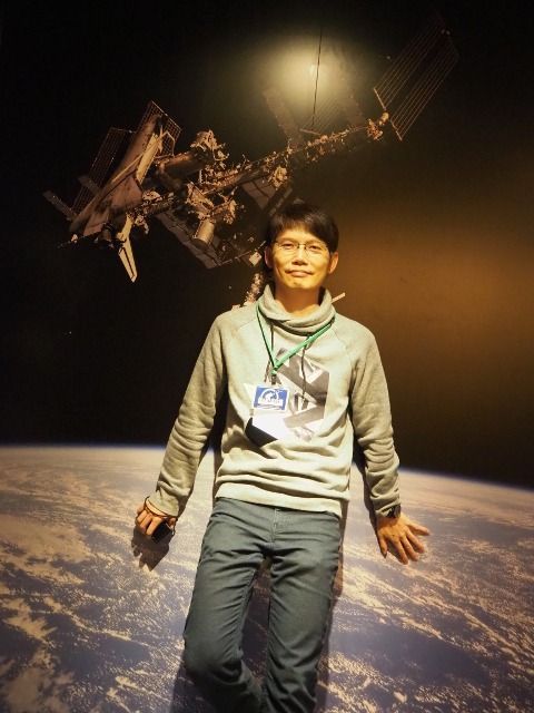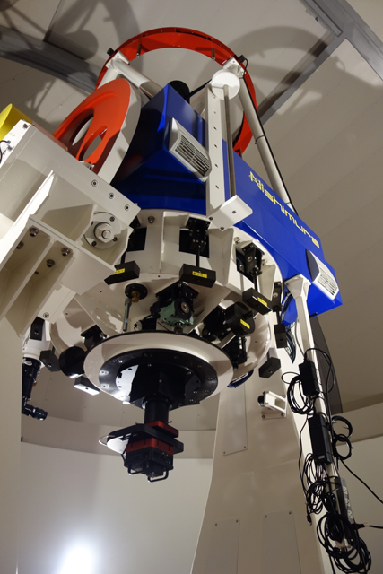 瞄了一圈,導覽員開講了,使用的語言不意外是日文,我也順理成章來個鴨子聽雷,頂多是隨他指向的圖板,猜測他究竟想表達什麼。腦袋漸漸放空之際,終於他把目標挪至正中的大型望遠鏡了,喔~~雖是雲雨天,還是有厲害的科技力可以應對嗎?望遠鏡緩緩轉動著,宛如成為變形金剛的前奏,我的視線也盯向穹頂閉合處,期待下個瞬間便能看到它隨轟隆聲張啟。