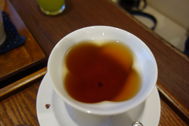 或許是聽到我心底的召喚,「戀濃茶鬆餅」也送達了,它最初似是「濃茶鬆餅」的情人節限定版,除了灑粉留白了愛心,茶杯也特製過,淺倒一些,茶湯會顯示出愛心,再加注則會轉為四葉草,相當別緻。雖無從知曉限定物為何現在還有,既給了機緣,不點來風騷好像也怪怪的。