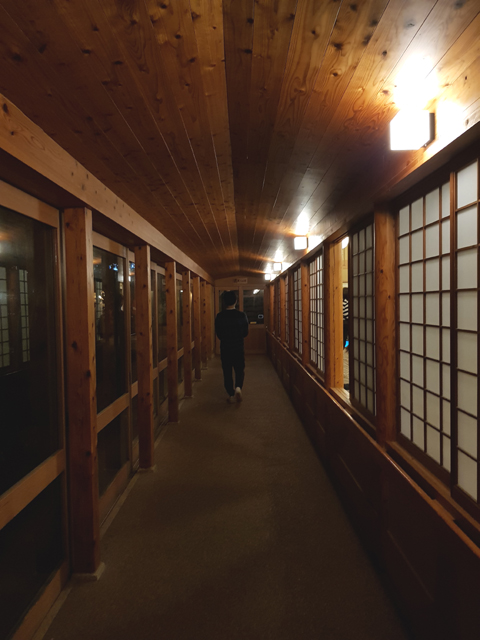 循著日式廊道前進,掀起男湯門簾,望見的更衣室木造柱牆交錯,再往裡依序有室內湯與露天湯接連。依照文案,露天湯其實有兩座,一個走自然山野路線,岩塊林叢圍擁,另個以簡練圓環切鑿,能遠眺丘下的「星野」。可惜兩者單雙日男女互替,只能體驗到一種,走去探看,我們遇上的是後者,而所謂的遠眺景致,在這夜裡自是一片漆黑了。