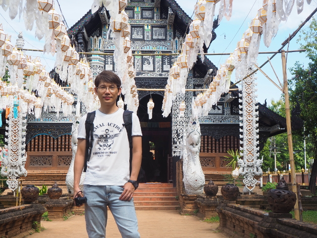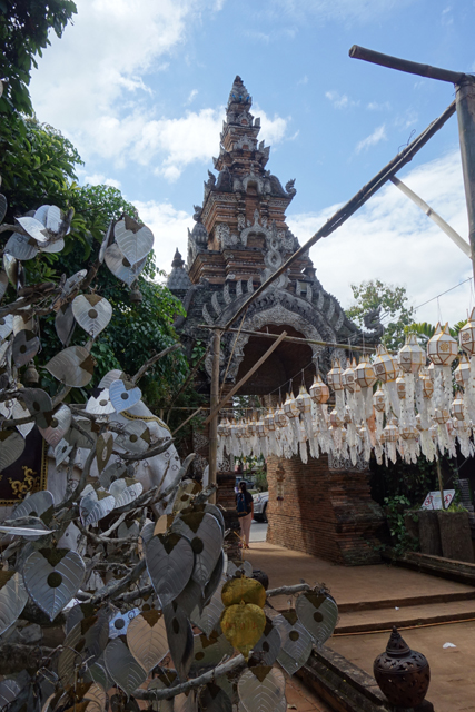 抱懷期待的心情穿入,由於水燈節方過,應景的燈飾尚未撤下,一排排懸於參道接連至主殿。儘管色白,在中式傳統裡會被嫌不吉利,此刻於藍天映襯下,便如自在浮空的擺尾遊魚,望著望著,心情也隨之輕揚,不由得想像著,若是在水燈節夜晚前來,會否便多了一重浪漫。除了燈飾,參道還另有點綴,白象兩側守護之餘,又設了金銀樹各一,爍亮的葉片皆是信徒的心願寄託,據說愛情是當中最靈驗的,莫名成為情侶必訪的勝地。