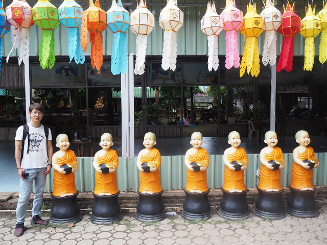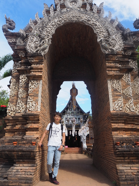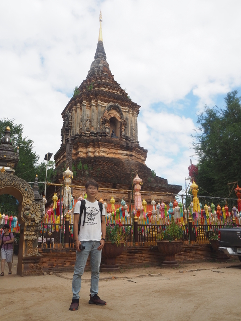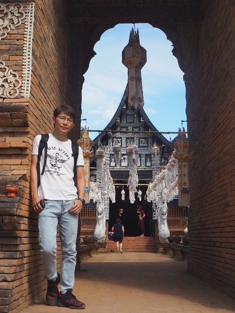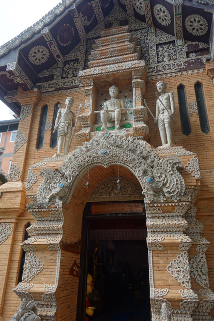 主殿背後是他們規制裡幾乎都有的佛塔,由斑駁的磚砌結構而觀,顯然是走過悠久歷史的建物,也的確,據說明板所寫,它砌於十六世紀,至今仍收納著當時「蘭納」國王及接任女王的骨灰,我循苔染斑跡往上望,除了顯然是近代加添的金爍塔尖,只有稜邊的折曲彰顯其風姿,但盛期的妝點應更加繁茂吧,塔身的上段仍殘了些灰泥覆面,留存幾許門額環綴與合十天女,很讓人藉其翻演,推擴出一座精雕石巒。那院裡其餘牆磚綻露的建物是否都曾有過覆面雕琢呢?只是因為凋殘,才全數補上新的鑲嵌紋飾?我隨步道走繞著,也揣想著。